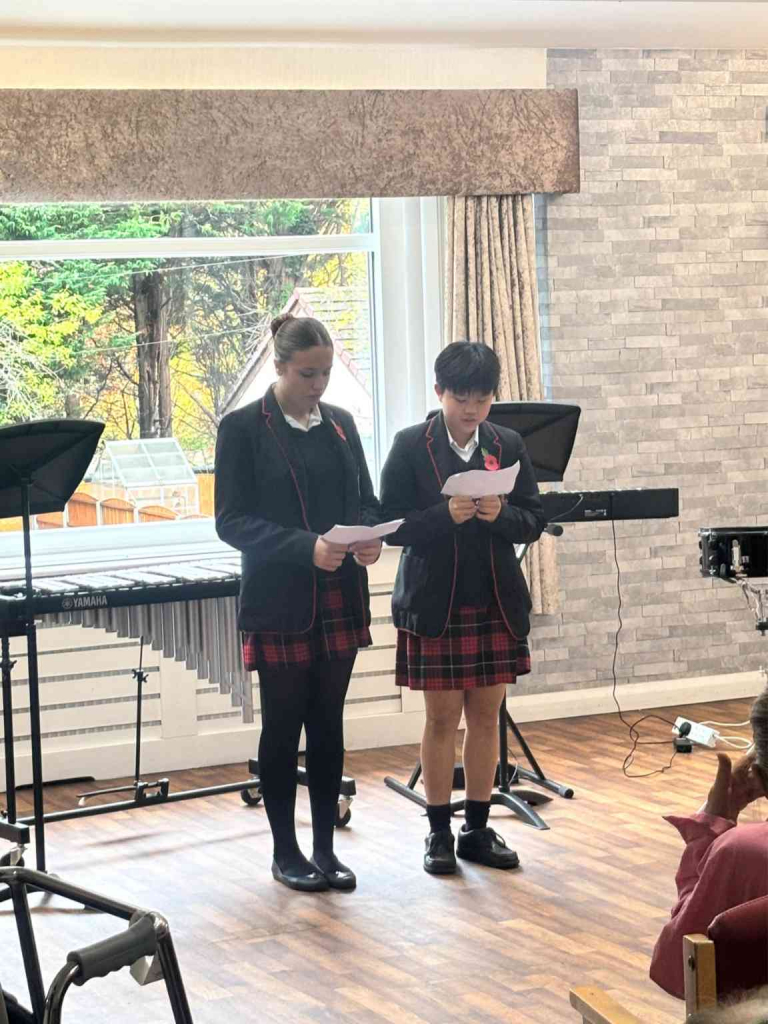 The event began with a moving reading of “Lest We Forget” by Abby and Jess, followed by a beautifully played rendition of The Last Post by Ismail. After a minute’s silence, the atmosphere lifted with a series of fun and heartwarming performances that brought smiles to everyone’s faces. It was wonderful to see our pupils chatting and connecting with the residents — moments that truly reflected the spirit of remembrance, respect, and unity between generations. The visit reminded us all of the importance of coming together as a community to honour the past and celebrate the bonds that link young and old alike. The residents enjoyed the visit so much that they have invited our pupils to return next month to perform some Christmas carols.